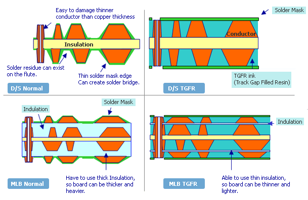 TGFR is the technique and process for filling the conductor spaces, which copper thickness is over 5oz, with special resin. |